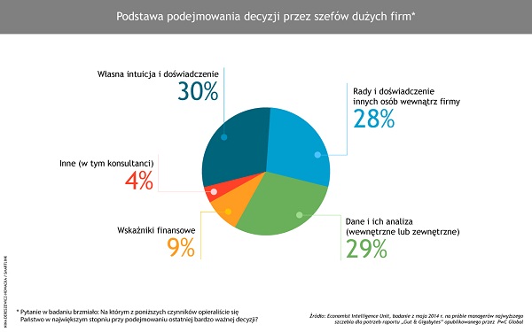 Wiedza i wynikające z niej rekomendacje działań to jedno, a ich realizacja, to często zupełnie inna sprawa. Odpowiedź na pytanie, jak wygląda to w przypadku największych firm na świecie i na ile wykorzystują one możliwości, jakie stwarza im „Big Data”, była jedną z najważniejszych kwestii poruszonych w publikacji PwC „Gut and Gigabytes”, wydanej w tym roku przez firmę doradczą PwC, a przygotowanej przez The Economist Intelligence Unit. Autorzy przyjrzeli się, jak podejmowane są najważniejsze decyzje w wielkich międzynarodowych firmach. Czy decydującą rolę odgrywają analizy danych, czy też szefowie w kluczowych momentach wierzą przede wszystkim własnej intuicji? Otóż bywa różnie. Zadziwiające jest, jak wielu menedżerów traktuje analizy danych z nieufnością. Chociaż zdecydowana większość deklaruje, że już dostosowała lub niedługo planuje dostosować swój proces decyzyjny do wyzwań związanych ze zjawiskiem „Big Data”, to jednocześnie tylko mniej niż co trzeci menedżer wysokiego szczebla przy podejmowaniu kluczowych decyzji kieruje się przede wszystkim analizą danych. Kolejne prawie dwie trzecie polega głównie na własnej intuicji i doświadczeniu albo na radach współpracowników (zob. infografika).